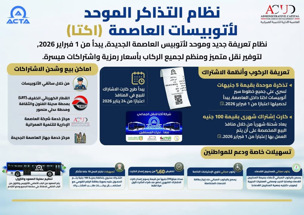 - تذكرة موحدة بقيمة 5 جنيهات: تسري على جميع خطوط سير أتوبيسات (اكتا) داخل العاصمة الإدارية فقط، ويبدأ تحصيلها في فبراير 2026.