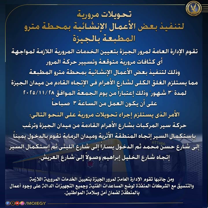 وذلك لتنفيذ بعض الأعمال الإنشائية بمحطة مترو المطبعة.. مما يستلزم الغلق الكلى لشارع الأهرام فى الإتجاه القادم من ميدان الجيزة لمدة “3 شهور” وذلك إعتباراً من يوم الجمعة الموافق 2025/11/28 على أن يكون العمل من الساعة 3 صباحاً.. الأمر الذى يستلزم إجراء تحويلات مرورية على النحو التالى:-