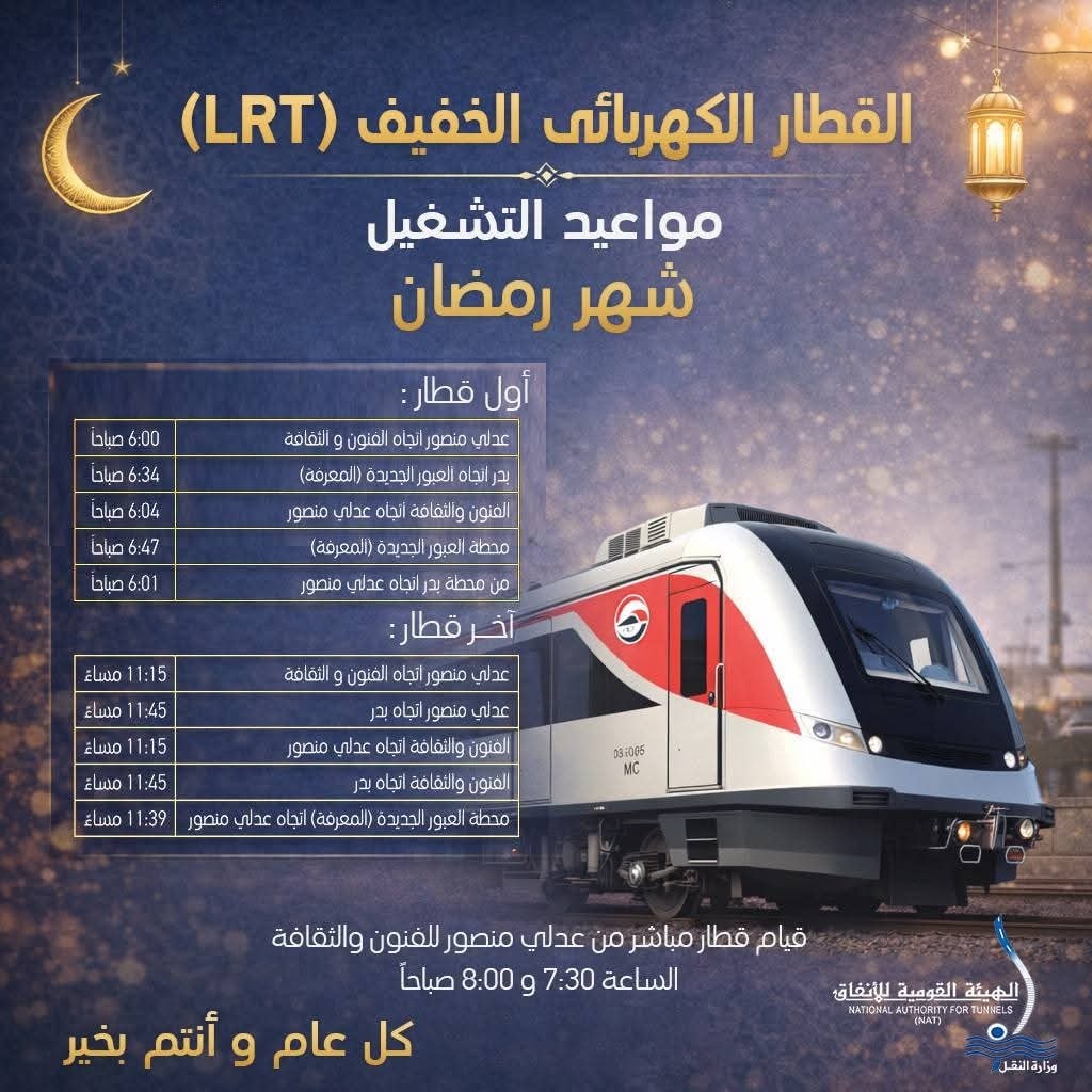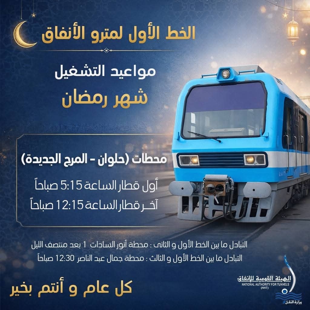 في إطار تقديم خدمات مميزة للمواطنين وتيسيراً علي جمهور الركاب تعلن الهيئة القومية للأنفاق عن انتهاء جميع الاستعدادات الخاصة بمناسبة حلول شهر رمضان المبارك لعام ١٤٤٧ هجرياً / ٢٠٢٦ ميلادياً من خلال تعديل مواعيد التشغيل لخطوط المترو الثلاثة والقطار الكهربائي الخفيف (LRT) مع بدء أول أيام شهر رمضان المعظم وبيانها كالتالي: